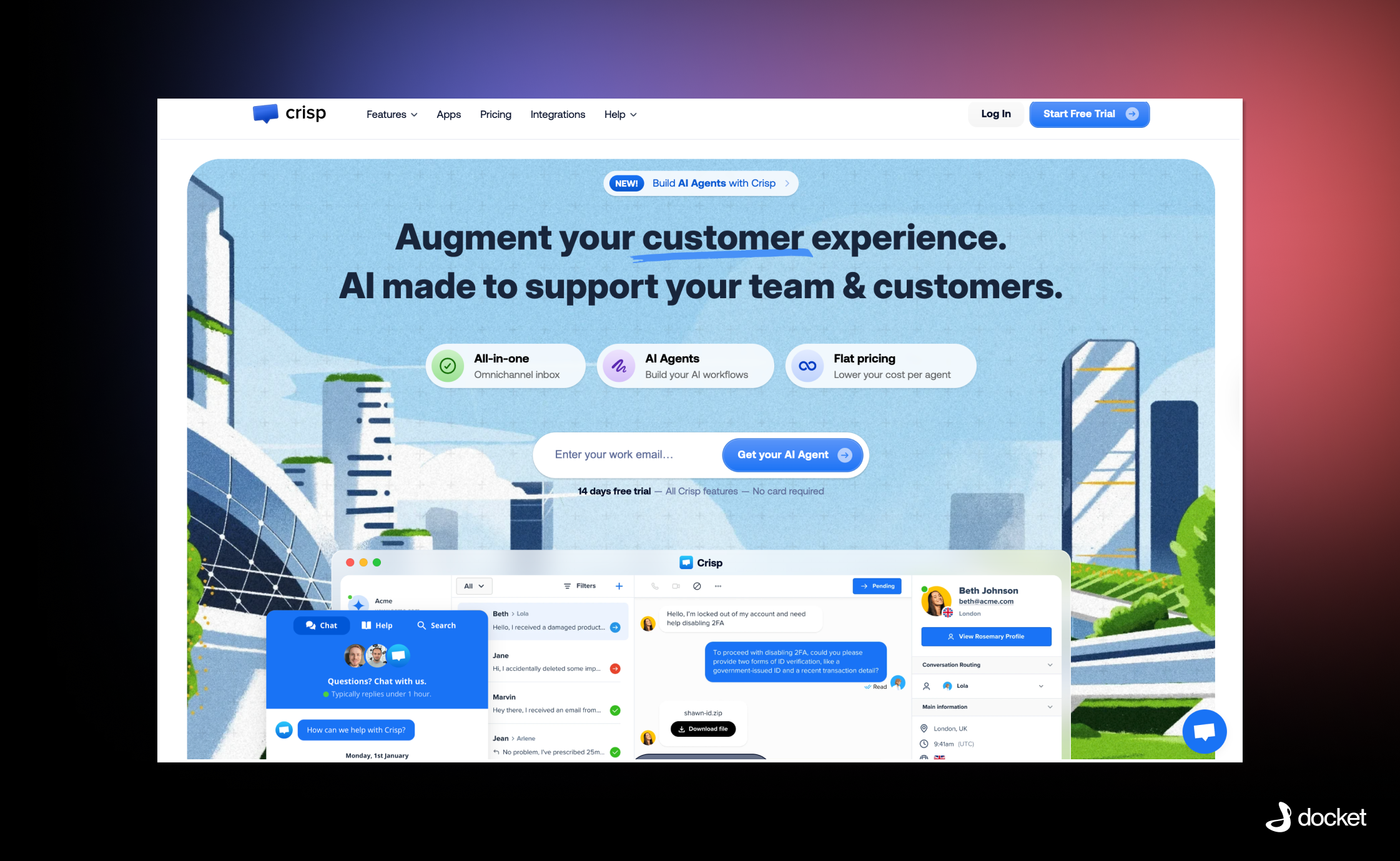Crisp combines chat, a shared inbox, bots, and a knowledge base into a single workspace. The pricing is per workspace rather than purely per seat, which keeps costs predictable as you grow. It integrates well with e-commerce and social channels for omnichannel support.