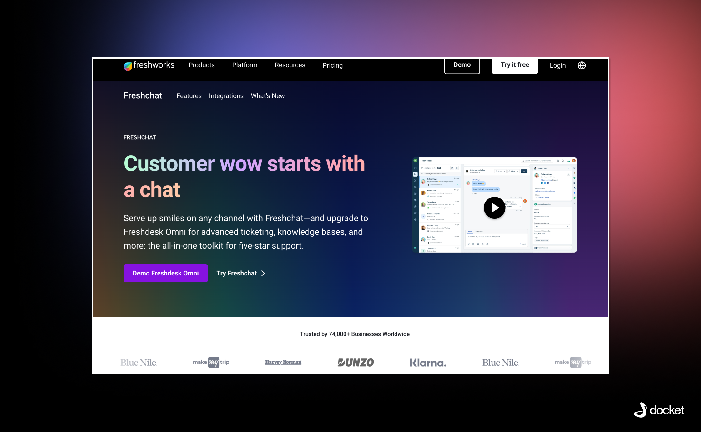 Freshchat provides modern site messaging, bots, and automation that integrate with Freshdesk and the broader Freshworks suite. Teams use it to resolve common issues quickly and keep a clean path to tickets or voice when needed. The interface is friendly and fast for small to midsize teams.