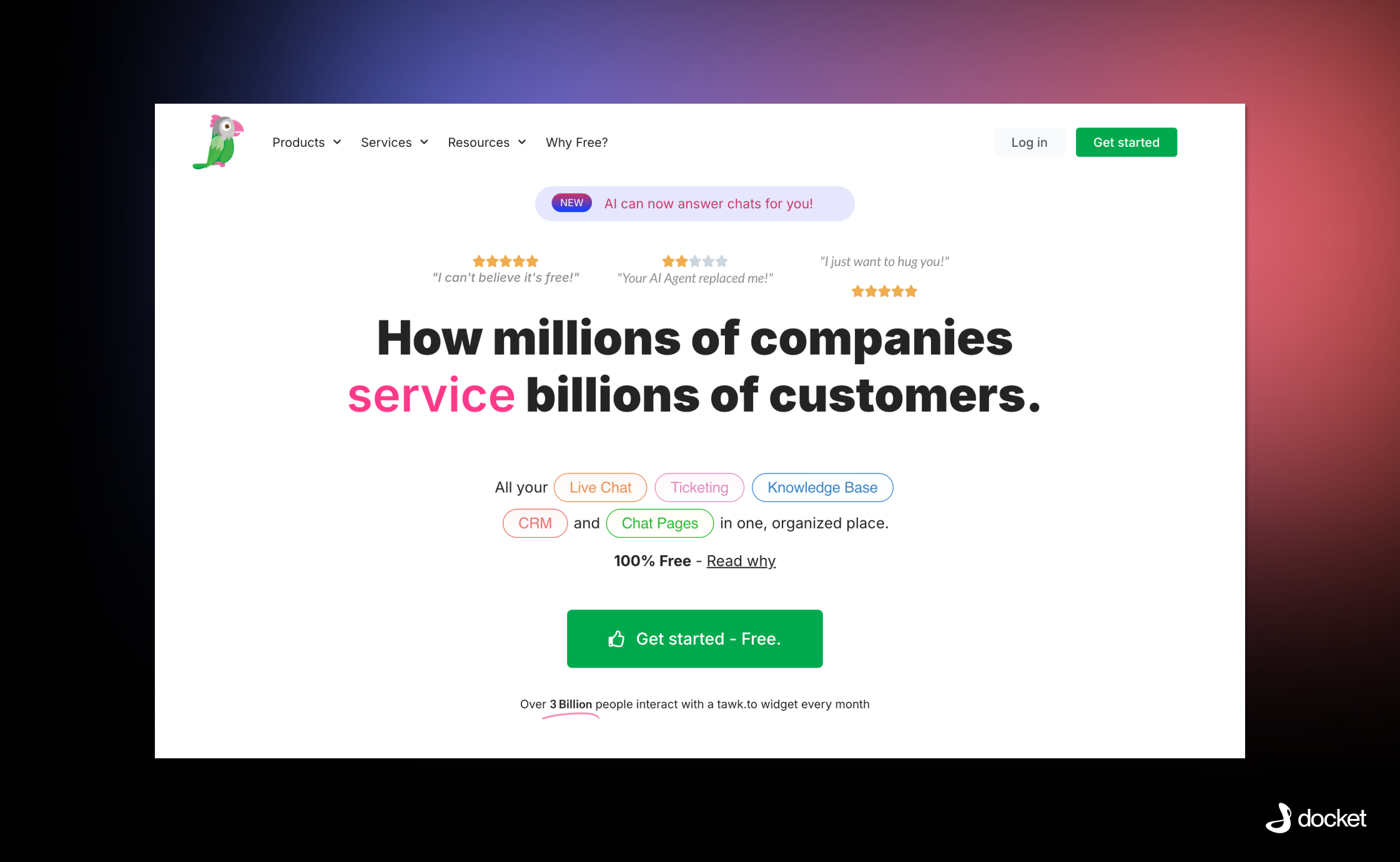 tawk.to offers a free live chat tool that many small businesses use to get started. It includes unlimited agents and chats with optional paid add-ons like AI Assist, video, voice, and even hired human agents if you need staffing. Teams that want to eliminate software costs often begin here.